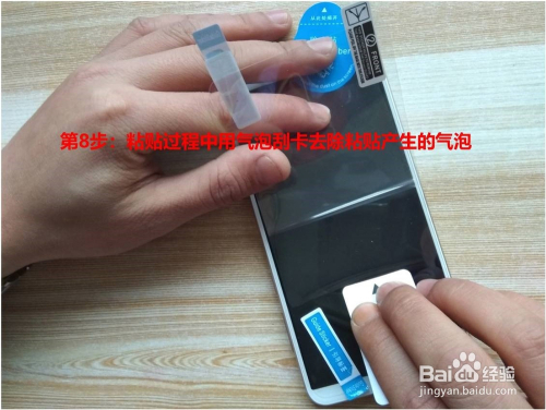 在粘贴的过程中多多少少都会产生一些气泡,这时就需要用气泡刮卡将气泡向手机屏幕未粘贴部分或者是屏幕边沿方向推出,千万不要等手机膜全部贴好后再去除气泡,一定要边贴边除气泡。