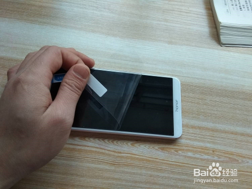 先将撕下保护膜位置的手机膜对齐手机听筒位置,然后慢慢的放下,让手机膜自动吸附到手机屏幕上。吸附好之后,再慢慢拖拉保护膜剩余未撕开的部分。