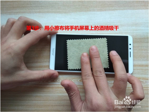 屏幕擦拭干净后,再用小擦布对手机屏幕和边框进行仔细擦拭,将残留在手机上的酒精和污物擦拭干净。