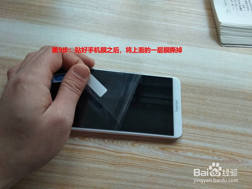 贴好手机膜之后,拉起引导标签,将手机膜表面的一层保护膜撕掉,贴膜完成。