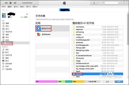 点击“文件共享”,在“应用”一栏中点击“酷狗音乐HD”,在“酷狗音乐HD”的文档一栏中点击kgcache文件夹(默认缓存目录)然后不要点同步!