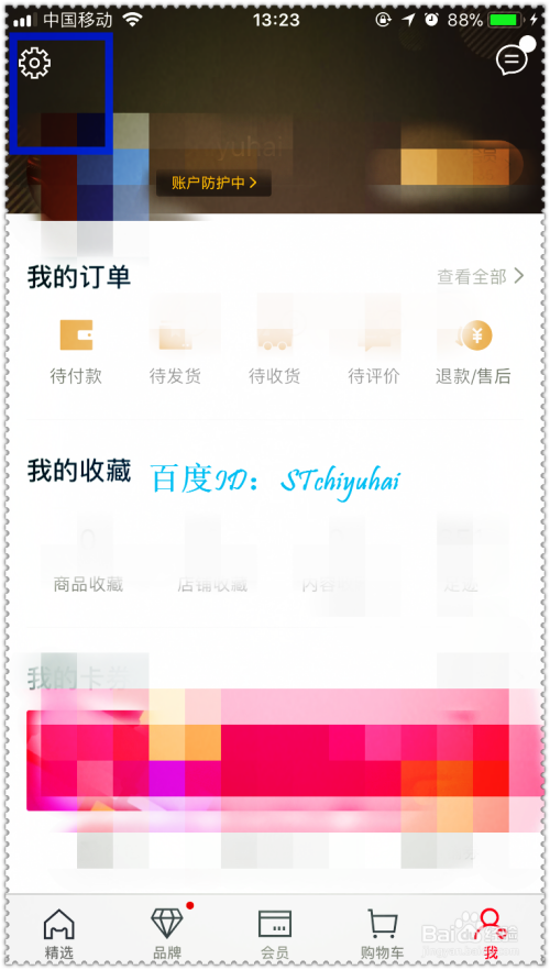 在天猫主界面底部,切换至“我”的界面。在我的界面左上角有个齿轮图标,点击进入设置界面。