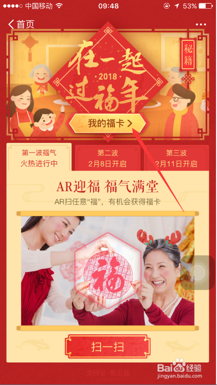 如果一次扫不出来,可以多试几次,如果扫出来福卡了,会有提示,“福卡来了”,如图所示。
