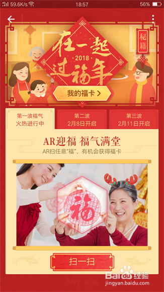 进去以后就会看到一共有三波活动,目前是第一波扫福,点开下面“扫一扫”,如果设置了权限打开相机权限就可以扫描了;