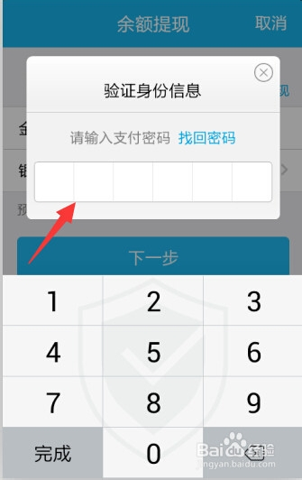 输入手机中收到的验证码,点击“确定”按钮,可以看到自己需要提现的金额和提现到的银行卡,可以直接点击“下一步”。(如下图)