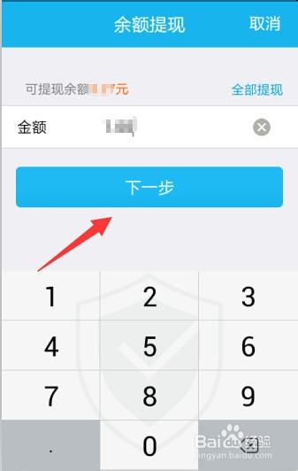 点击“提现”按钮,来到余额提现页面,输入要提现的金额数字,再点击“下一步”。(如下图)