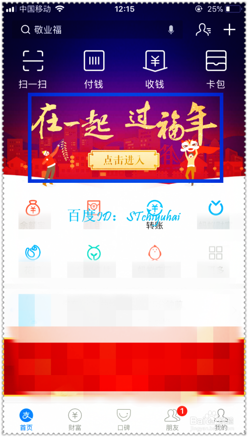这里以iPhone手机端的支付宝App作为操作截图,供参考,将支付宝App更新至最新版本。打开支付宝,进入主界面,可以看到“在一起过福年”活动入口。