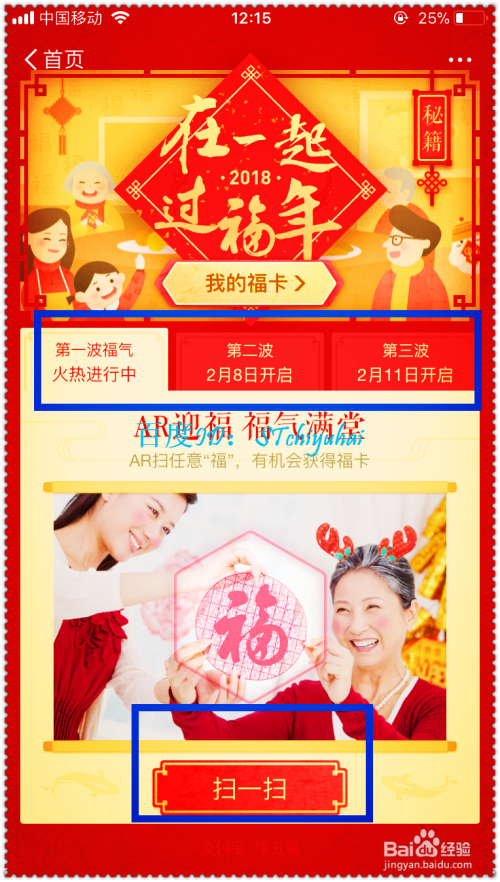 进入活动界面,点击“去迎福气”开始正式的活动,在主界面可以看到活动的三个阶段,今天开启第一阶段扫福。