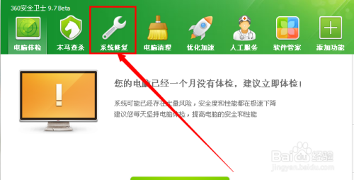 第一,打开360安全卫士,在上面的栏目里找到【系统修复】,点击进入。
