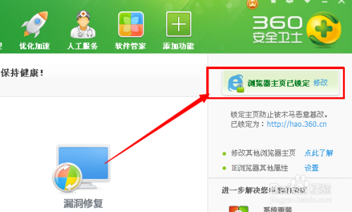 小编电脑使用的浏览器是360极速浏览器,对于这个主页的修改非常简单,修改主页后可以在360安全卫士里进行主页锁定,这样打开的主页就不会被随意篡改了。
