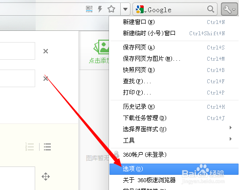 第一,打开360极速浏览器,在右上方找到工具的图标,点击进入下拉菜单,找到【选项】进入。