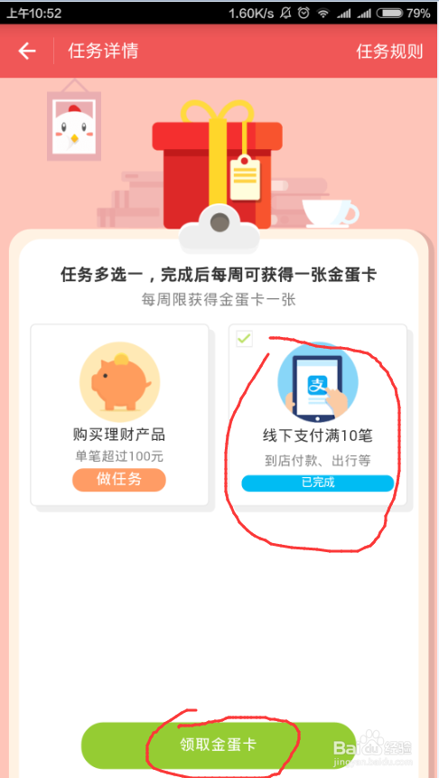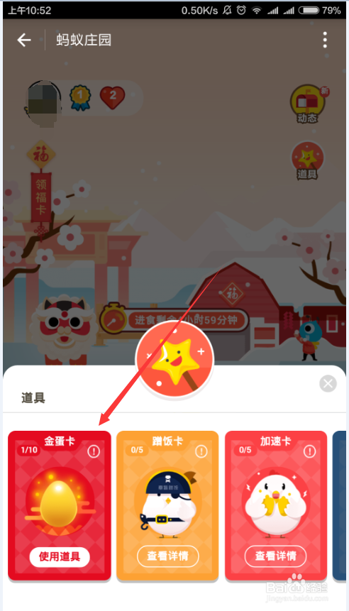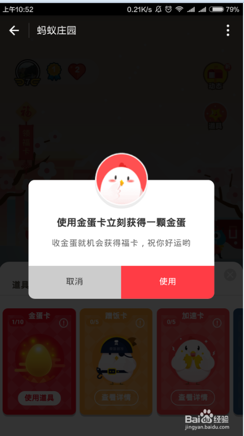 也可以通过道具来获取一个金蛋,如下图所示,每周消费达标后,可以获取一张道具卡,来换取一个金蛋,使用道具也很简单,参考下图的操作就可以了,等金蛋收集满后就可以收取了