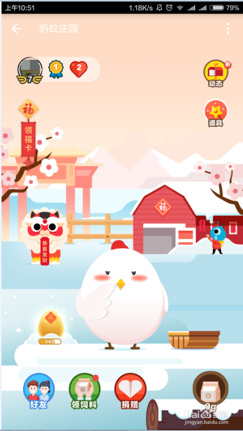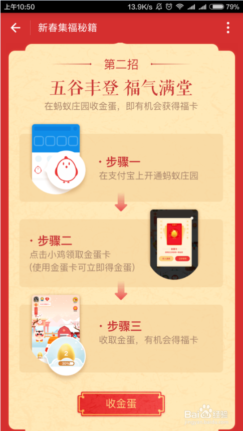 本经验文章主要介绍一下,支付宝“在一起,过福年”的活动,怎么收金蛋领福卡,也就是支付宝蚂蚁庄园的小鸡下蛋收蛋的小游戏怎么玩