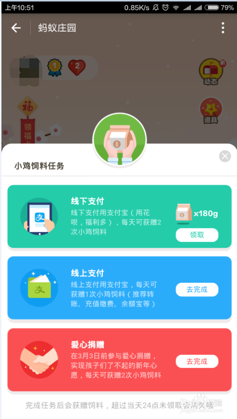 下面简单介绍一下游戏的过程,每天可以通过蚂蚁庄园里的任务,获取饮料,如下图所示