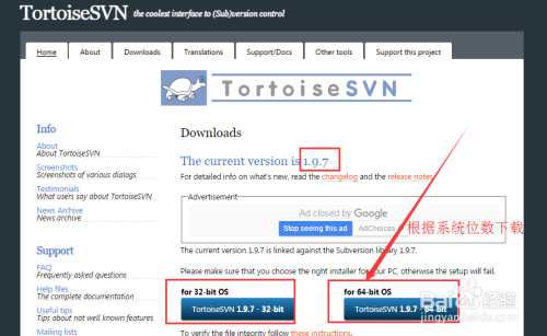 会弹出最新的TortoiseSVN版本下载界面,如果这个版本可以,那就点击图中标出的红色框框下载对应的版本。有32位和64位根据自己系统的位数来定。