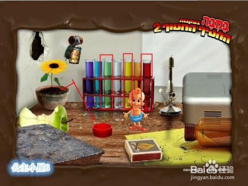 点击瓶子,取下瓶盖。点击试管,按三组颜色分别试验取得混合液体,再将液体倒入花盆中。会发现第二组颜色取得的液体会让花开。