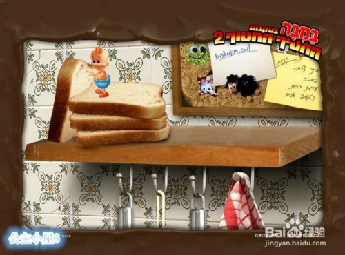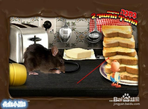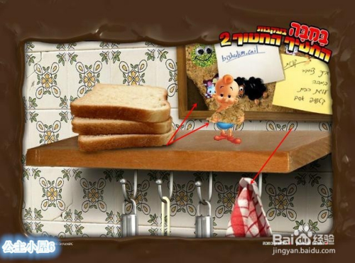 点击面包机,爬上去,被弹起的面包片弹到左侧的窗口附近。跳下窗子过关。