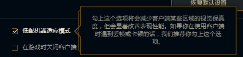综合设置菜单里面的第一个选项为:“低配机器适应模式”,勾选它之后对于游戏的流畅度有很好的改变。