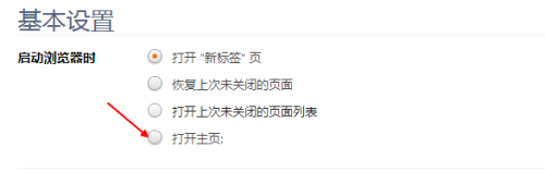 点击以后,我们就把第一项浏览器打开时后面选择到打开主页这个按钮上。这个意思就是我们打开浏览器,显示的就是主页的。