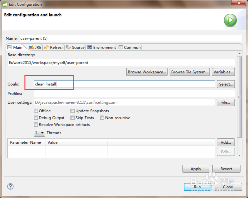 在运行配置中输入: clean install (安装操作)然后执行安装操作就可以进行安装将项目安装到本地私服中,