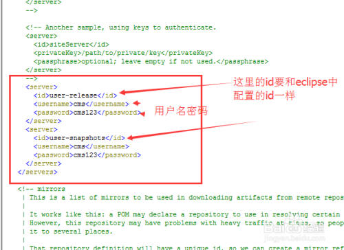 在maven的settings.xml中增加发布信息service的配置.主要配置id以及用户名和密码配置完用户名和密码之后,然后点击保存即可,用户名和密码一般都是明文存储,