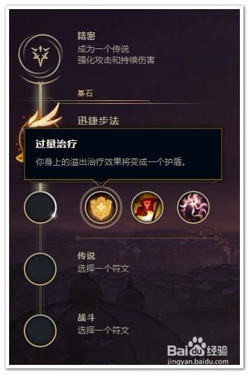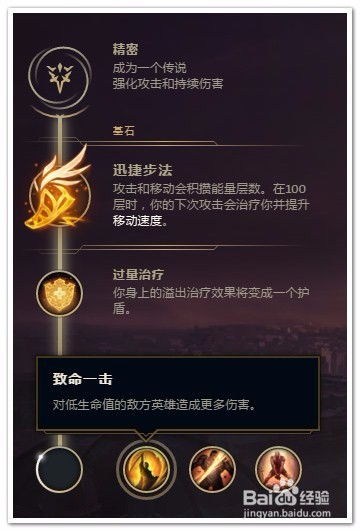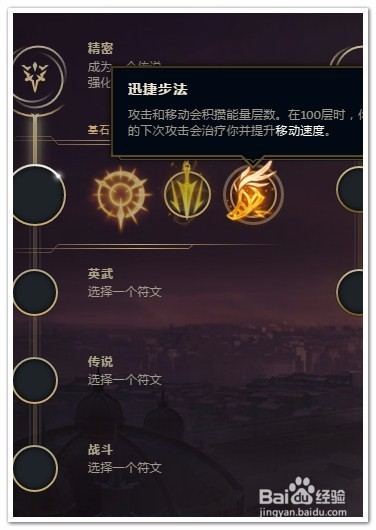 在三个基石里选择“迅捷步法”。前期弱势,尤其对上强力AP,选择迅捷步法回血。