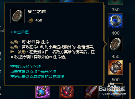 出门装带的是多兰剑或者多兰盾。具体看对线的英雄而定。但是一般带多兰盾对任何英雄都是可以的。