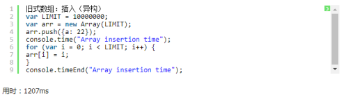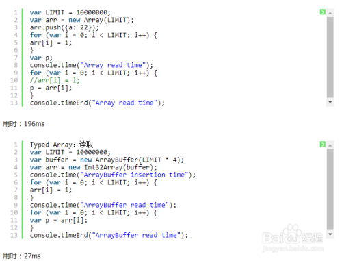 旧式数组和 ArrayBuffer 的性能不相上下,现代编译器已经智能化,能够将元素类型相同的传统数组在内部转换成内存连续的数组。第一个例子正是如此。尽管使用了 new Array(LIMIT),数组实际依然以现代数组形式存在。