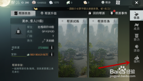 之后我们在第二步的地方,点击”帮派“,进入到自己的帮派界面,没有的可以先加入帮派,我们在帮派界面点击右侧的”福利“选项,如图所示。