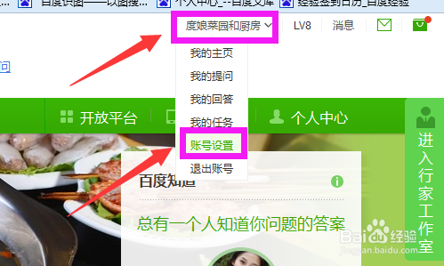 登录百度知道首页,点击百度昵称,点击“帐号设置”。