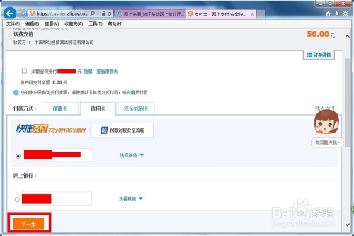 系统继续跳转到支付宝付款页面,你可以选择银行卡,然后点击下一步!