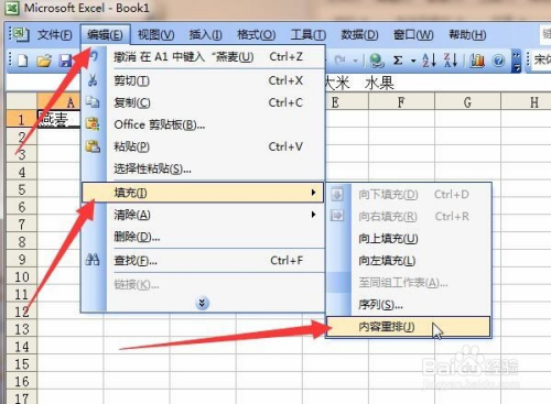 接下来点击编辑菜单,在弹出的菜单中选择填充命令,继续在弹出的下级菜单中选择内容重排。