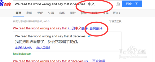 这个时候我们点击搜索百度默认的会使用百度翻译这款小工具帮我们翻译成中文显示,这个 方法仅仅适用于词句,如果你希望翻译的是一大篇文章或者很多词句的话,我们可以点击百度翻译跳转到主页面。