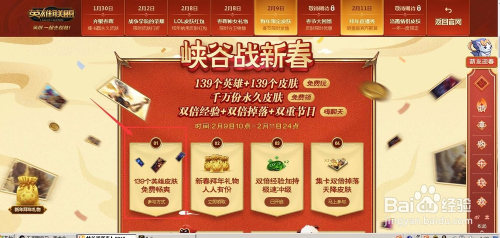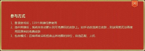 我们领完礼物之后,下拉找到峡谷战新春大标题,标题下第一项就是139个英雄免费使用的规则,点击参与方式阅读。