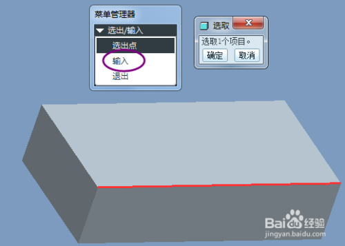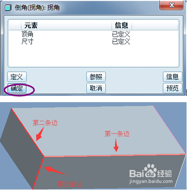 重复步骤4和5,选择如下的第二条边和第三条边,倒角长度分别为20、10,点击“倒角(拐角)”定义框的“确定”。