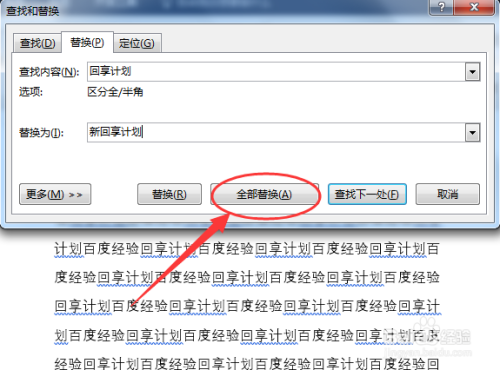 在【查找内容】中输入【回享计划】,在【替换为】输入【新回享计划】