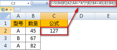 =SUM(IF((A2:A4="A")*(B2:B4>40),B2:B4))