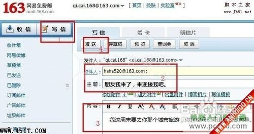 2、然后写收件人的邮箱和主题,如 haha520@163.com, 如果用的是QQ的邮箱,就写QQ的,如:123168@qq.com。 只是各个公司的邮箱后缀不一样。