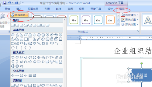 改变组织结构图的形状。为了区别对待不同层次的关系,我们可以选择相应图形的形状;我们单击“格式”“更改形状”在出现的下拉表中,我们选择想要的图形。