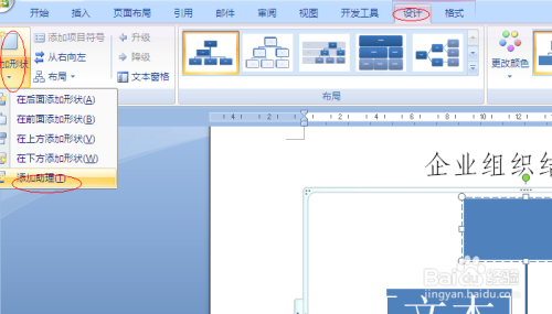 这会默认的图形可能还不符合我们的要求,我们选中第一行的矩形图形,然后单击“设计”“添加形状”按钮,在下拉菜单中选择“添加助理”选项