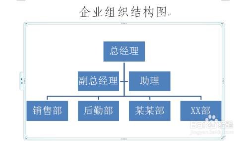在组织结构图中添加文字。设置好布局后,就可以添加文字了,选中第一行矩形,确定插入点在其中,输入“总经理”,再输入的时候,字体会自动调节大小。按照同样的方法,依次输入相关的内容。