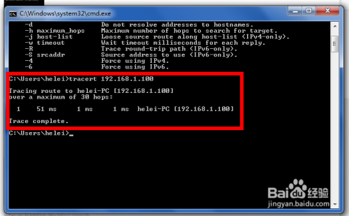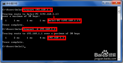 在“tracert”命令与IP地址或URL地址中间输入“-d”,可以不将IP地址解析到主机名称。从下图可以看出,添加了“-d”后将不显示出“PC-helei”字样,即不显示主机名称。