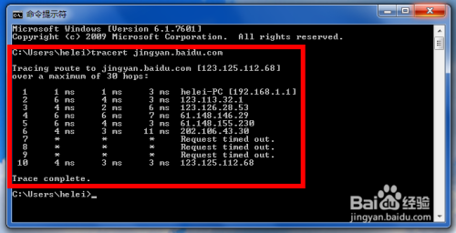 也可以输入“tracert ”后面接一个网址,DNS解析会自动将其转换为IP地址并探查出途经的路由器信息。如这回在后面输入了百度经验的URL地址,可以发现共查询到10条信息,其中带有星号(*)的信息表示该次ICMP包返回时间超时。