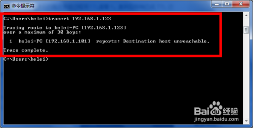 在命令行中输入“tracert ”并在后面加入一个IP地址,可以查询从本机到该IP地址所在的电脑要经过的路由器及其IP地址。下图中后面的IP地址为同一个路由器下的局域网中的另一个电脑的IP地址。
