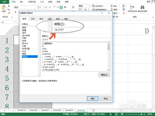 ②在右侧“类型”中输入格式公式“0.????”,点击“确定”。