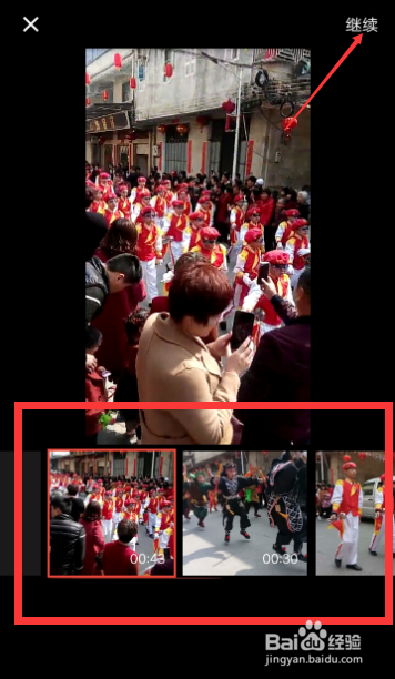 滑动下面的视频,找到自己想要上传的视频,点击“继续”。