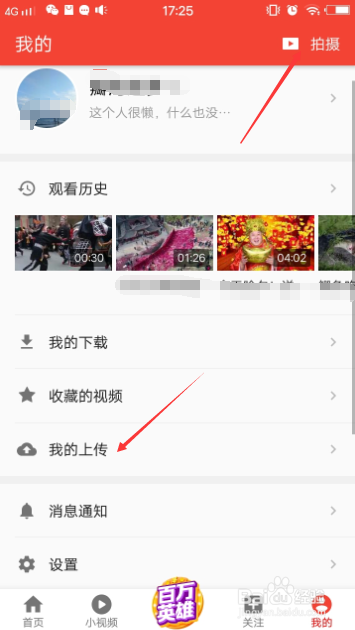 点击“我的上传”。(或直接点击右上角的“拍摄”)