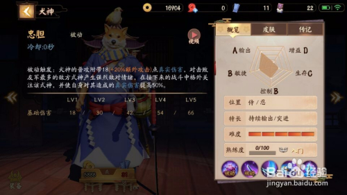 犬神的另一个被动技能是忠胆,效果是犬神会比较针对敌方杀死队友最大的式神,当攻击这个式神的时候犬神的攻击力会明显的增加,可以多造成50%的真实伤害。前期应该学一级,效果非常明显。