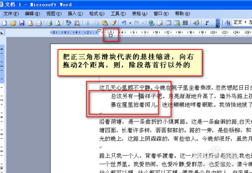 拖动吊挂缩进滑块标的目的右2个距离,则调整段落的非首行标的目的右缩进2个距离,结果如图:
