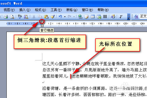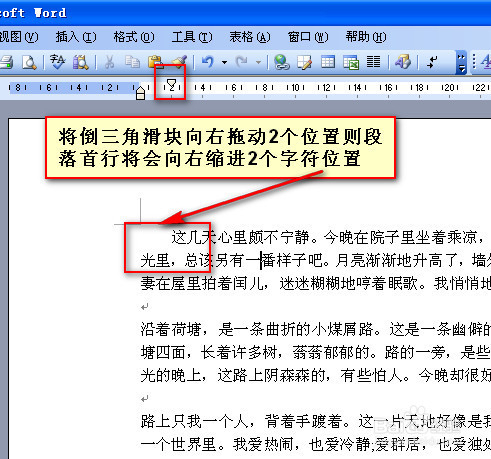 拖动首行缩进滑块标的目的右2个距离,则调整首行缩进标的目的右2个距离,如图: